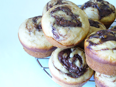 I forgot how thick Nutella was -- it was kind of a pain to swirl through the batter, especially when I scooped too much of it into the cups. In the end it was more like swirling the batter into the Nutella than vice versa. Still, I thought the overall effect was quite nice.